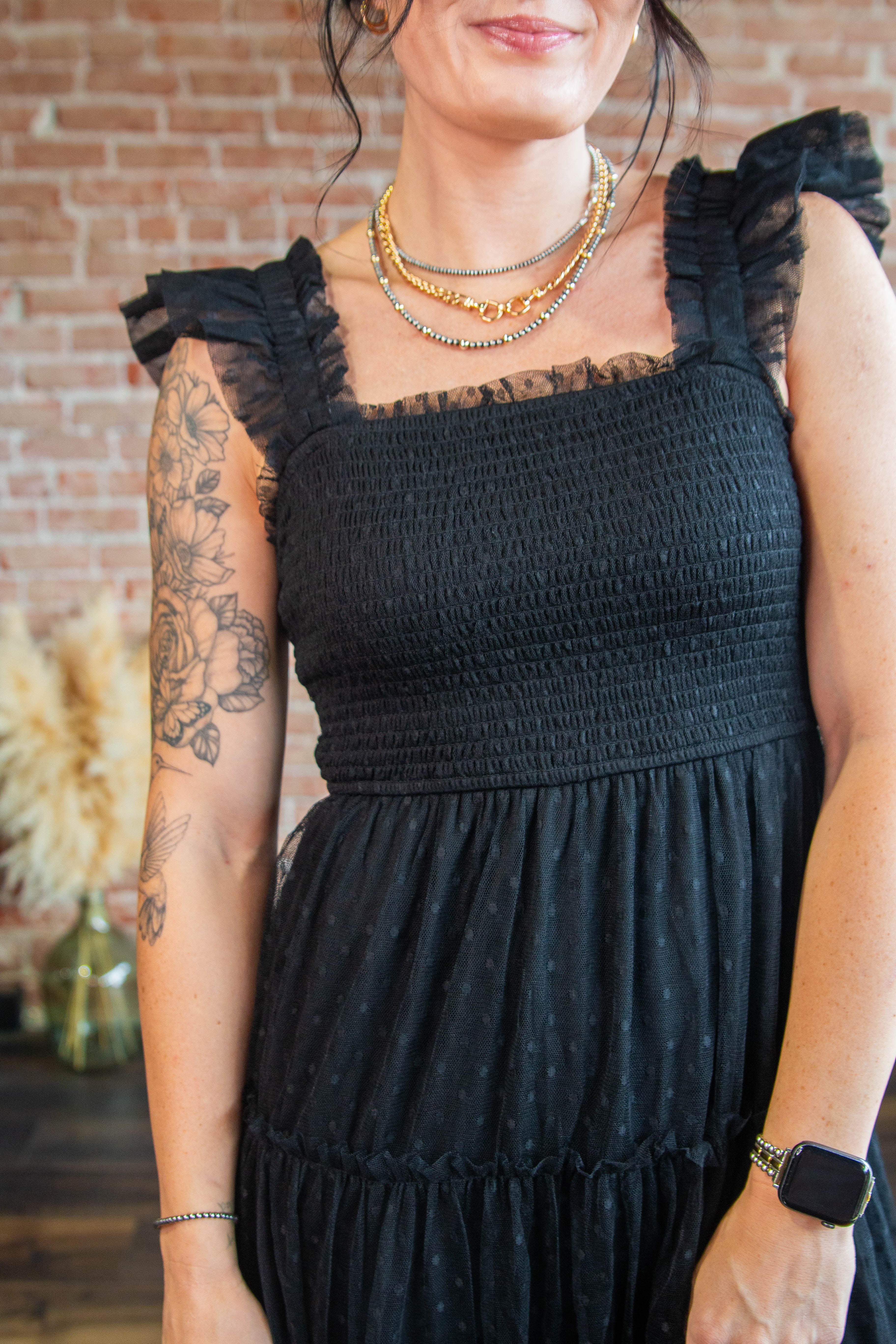 Meet the little black dress you’ll reach for on repeat. Our Black Smocked Tiered Midi Dress blends romantic details with an effortlessly flattering fit—perfect for weddings, date night, holiday parties, or any dressy fall event.