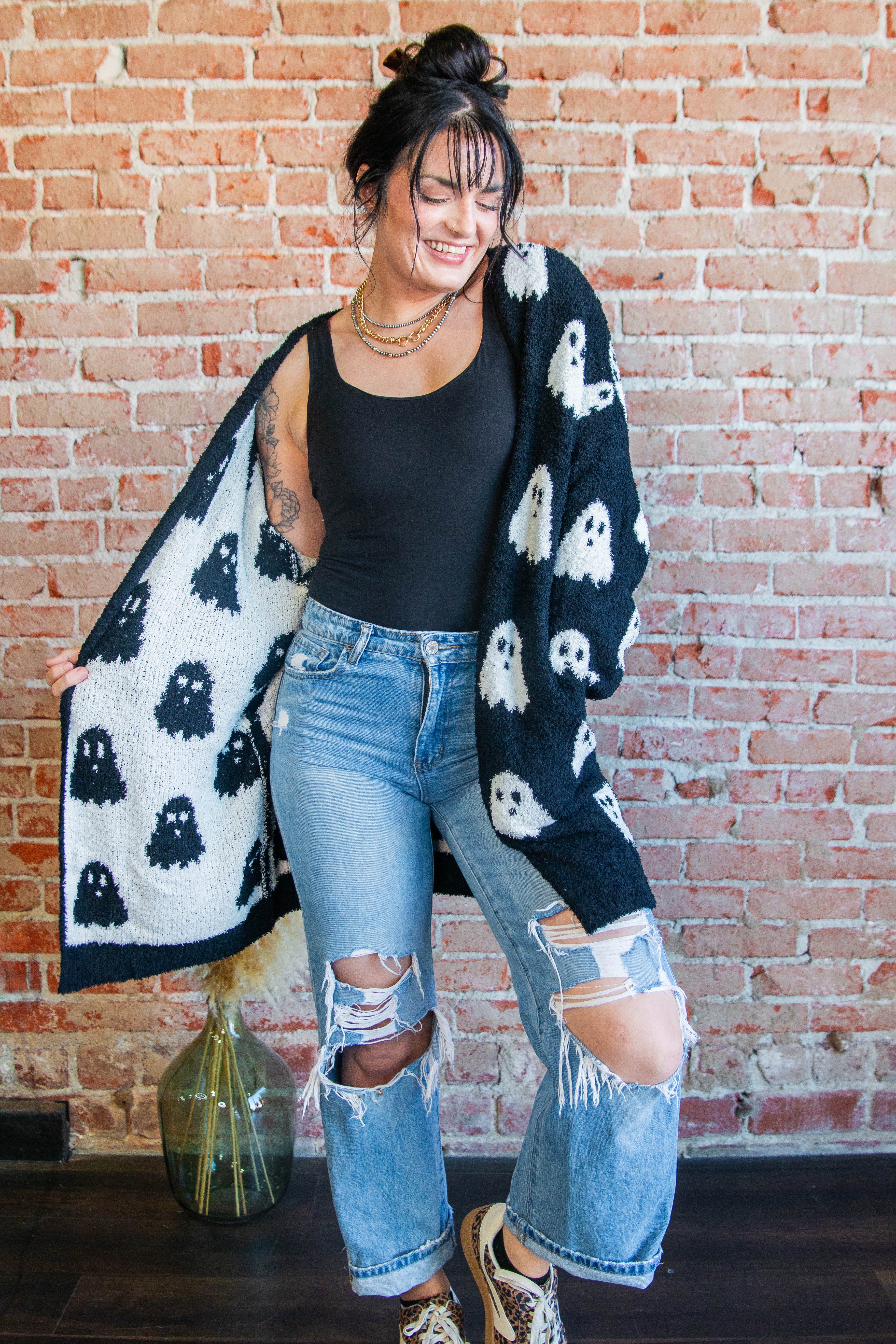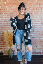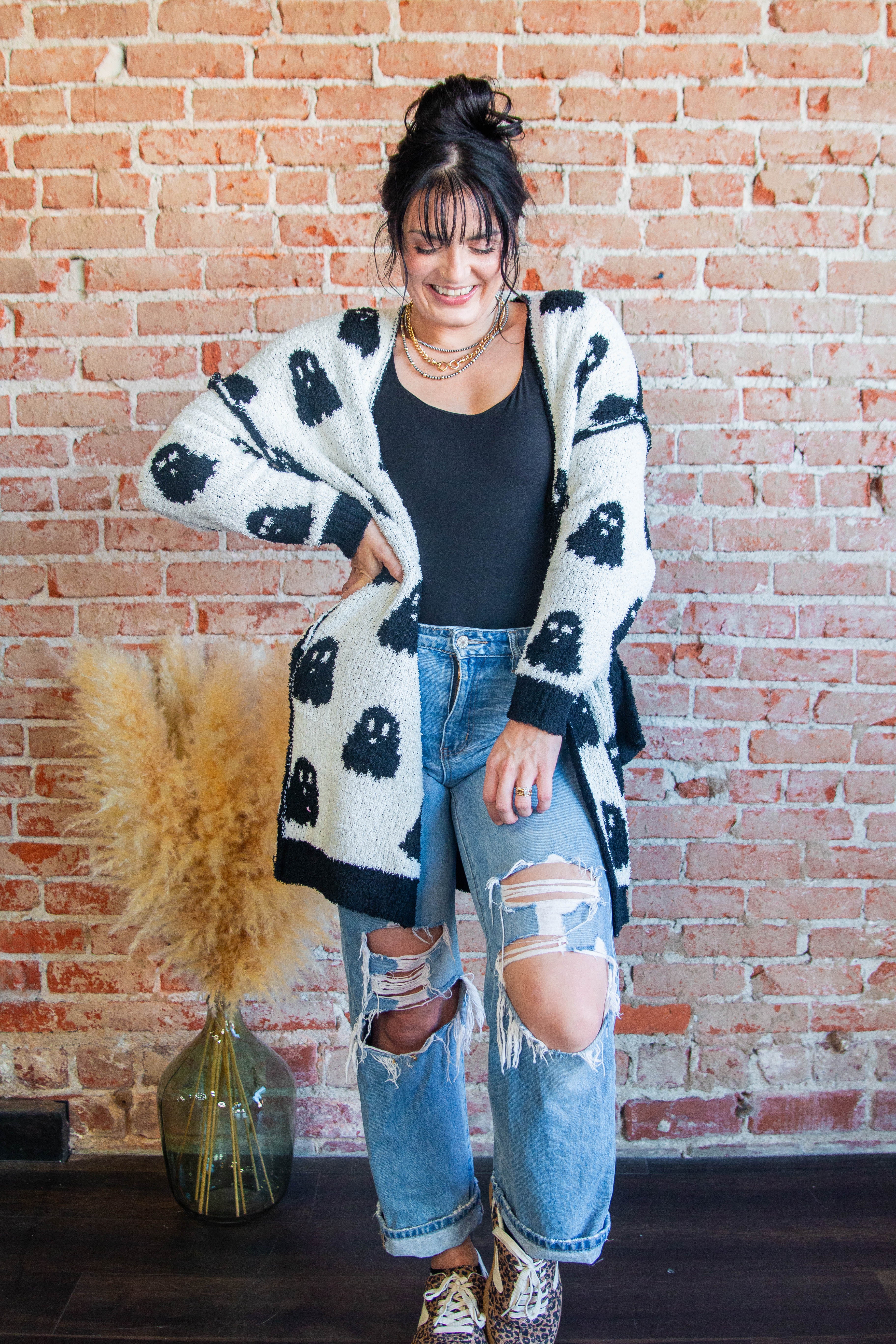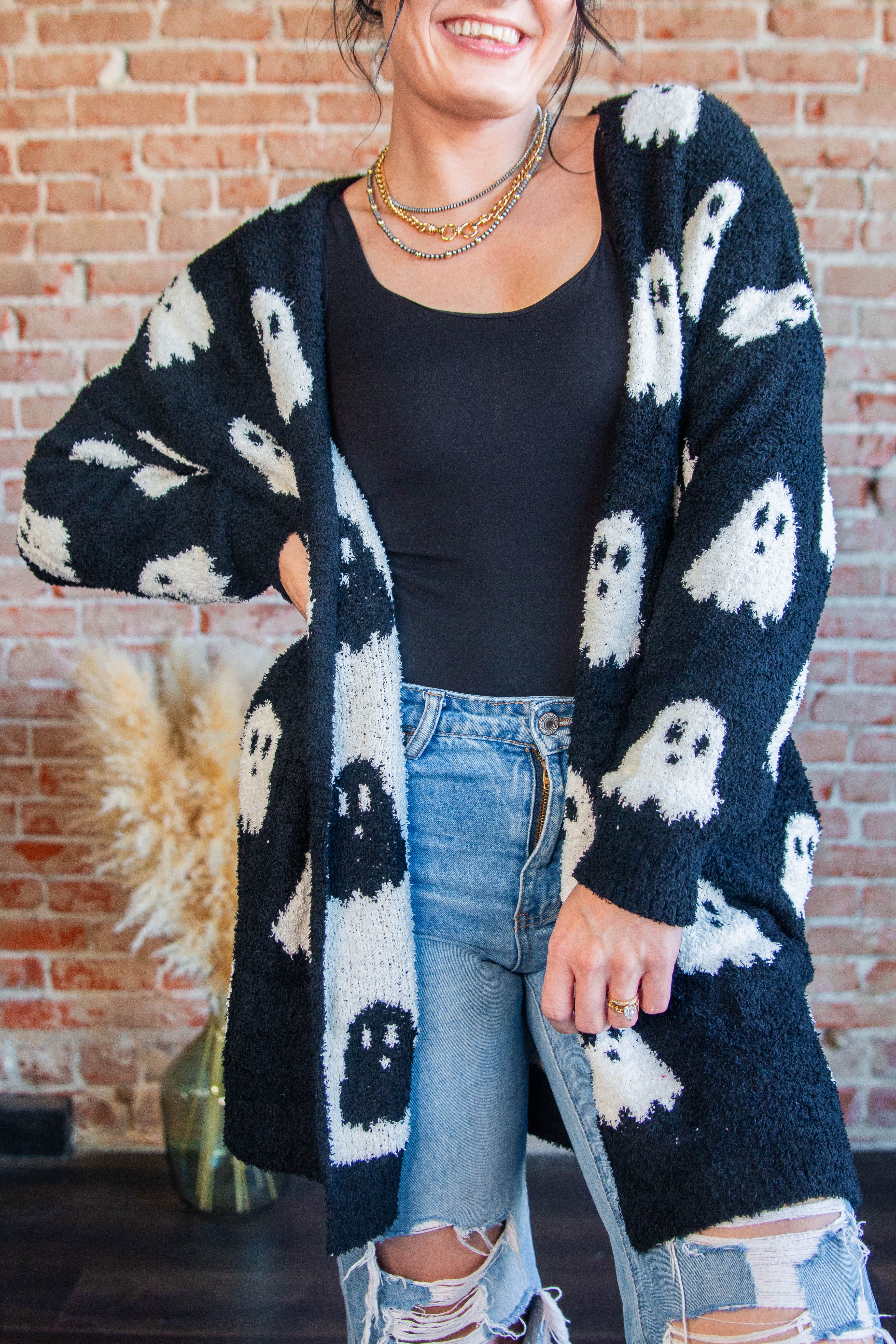 Double the cozy, double the boo-tiful. Our Reversible Black & White Ghost Cardigan flips from black-with-white ghosts to white-with-black ghosts for two festive looks in one ultra-soft layer. Knit from plush, cloud-like 100% polyester (think luxe lounge fabric—many say even softer), this longline, open-front cardi is the easy throw-on you’ll live in all season.