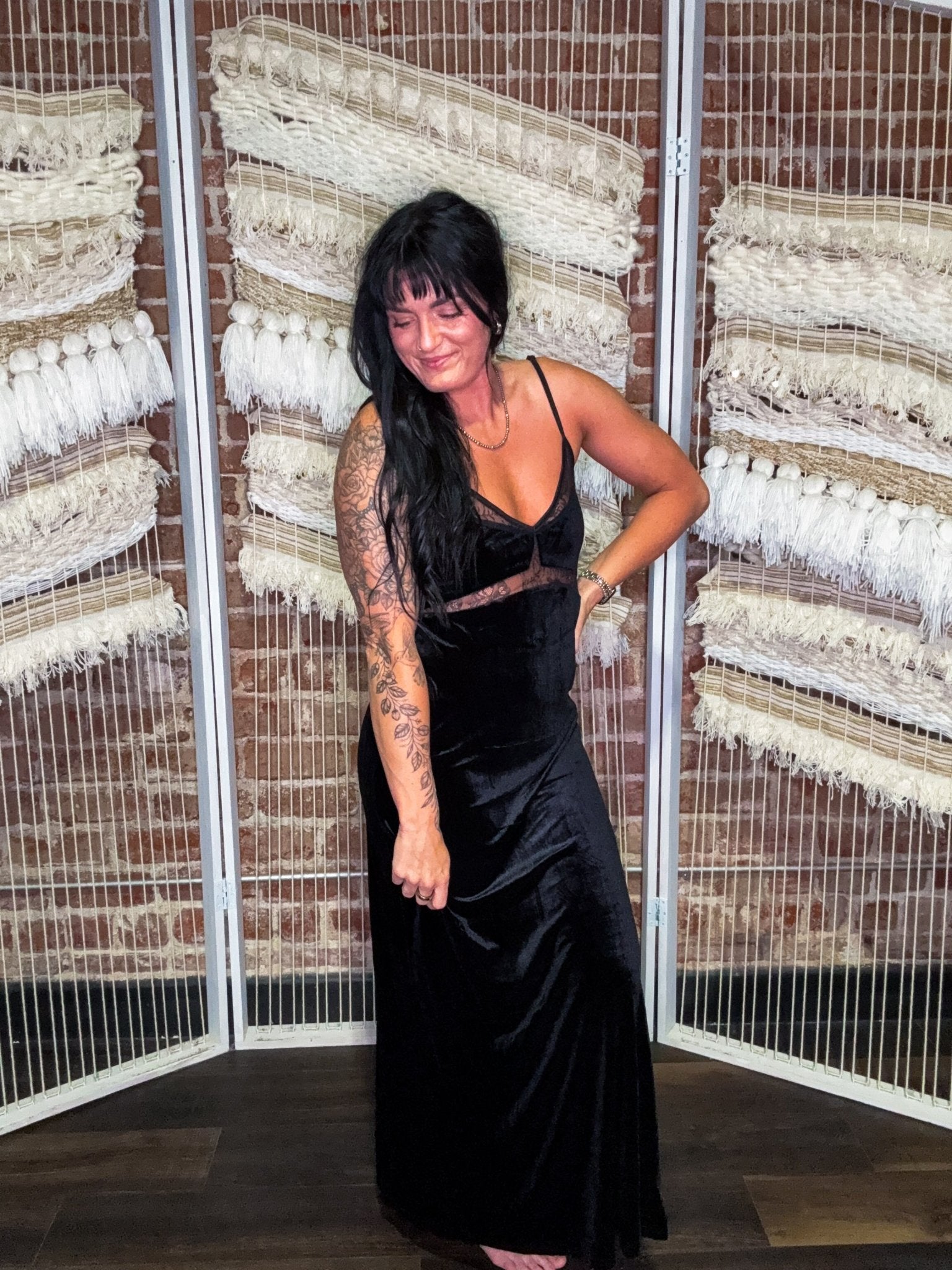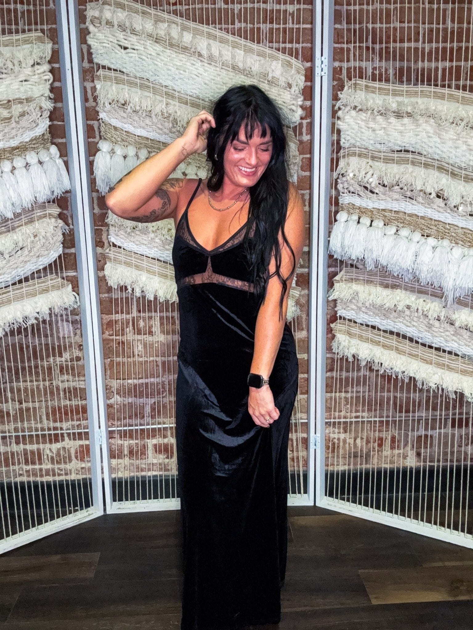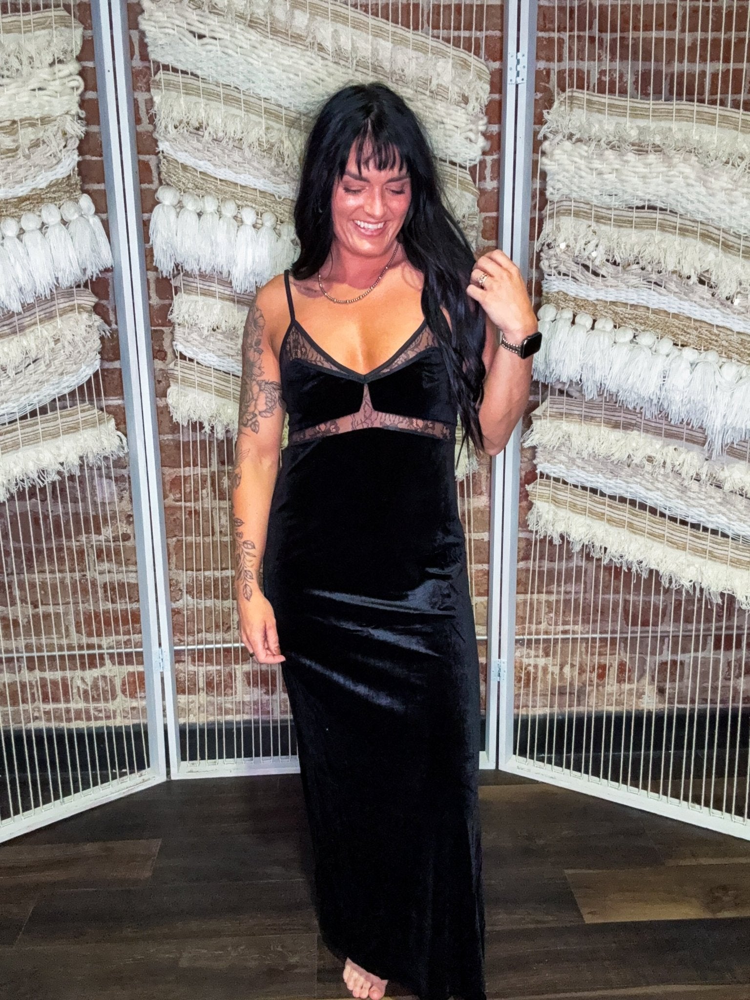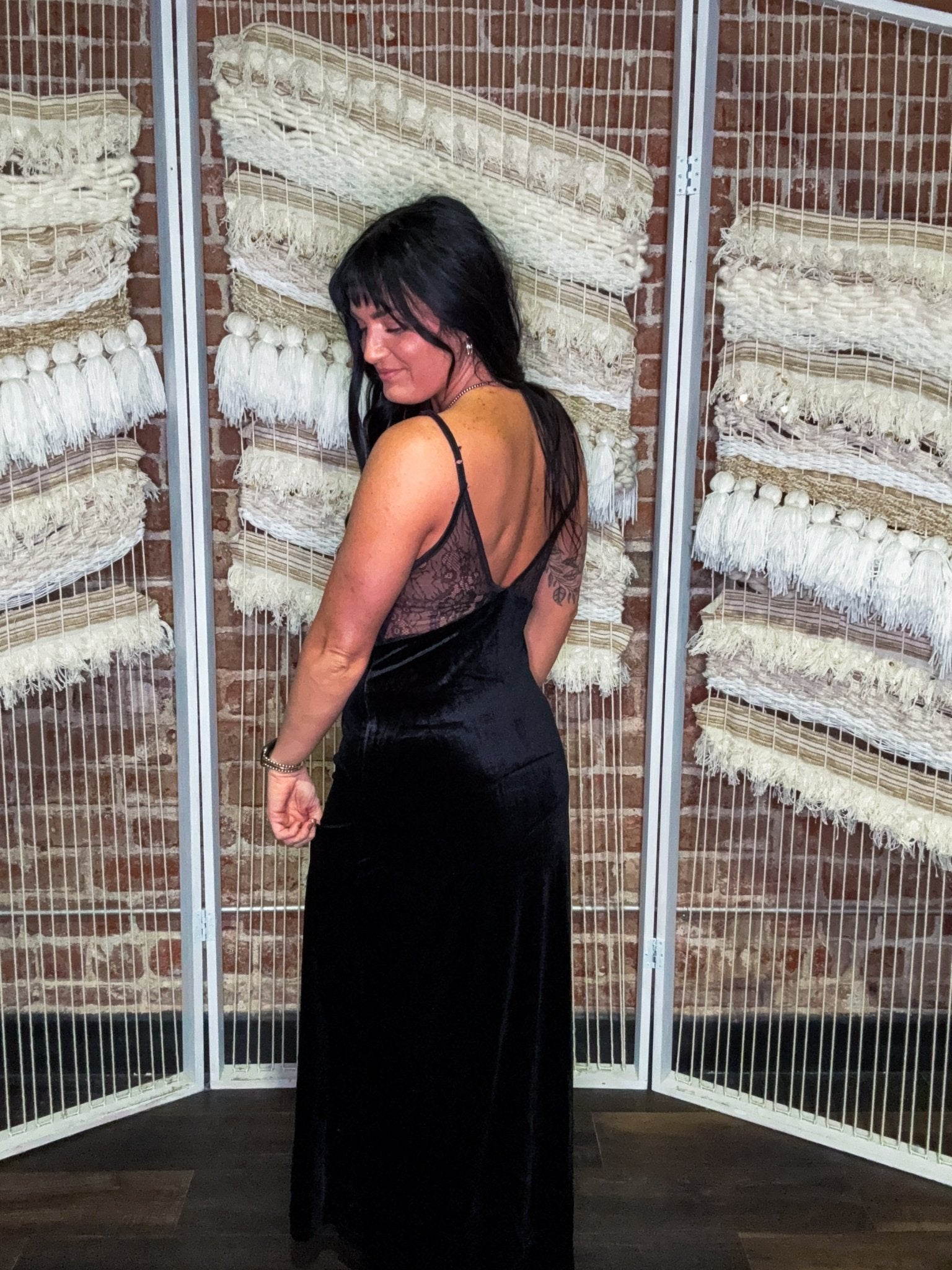 Bring the holiday glam. This luxe velvet maxi skims and elongates with flirty lace detailing and a dramatic low V-back—made to turn heads at every party.