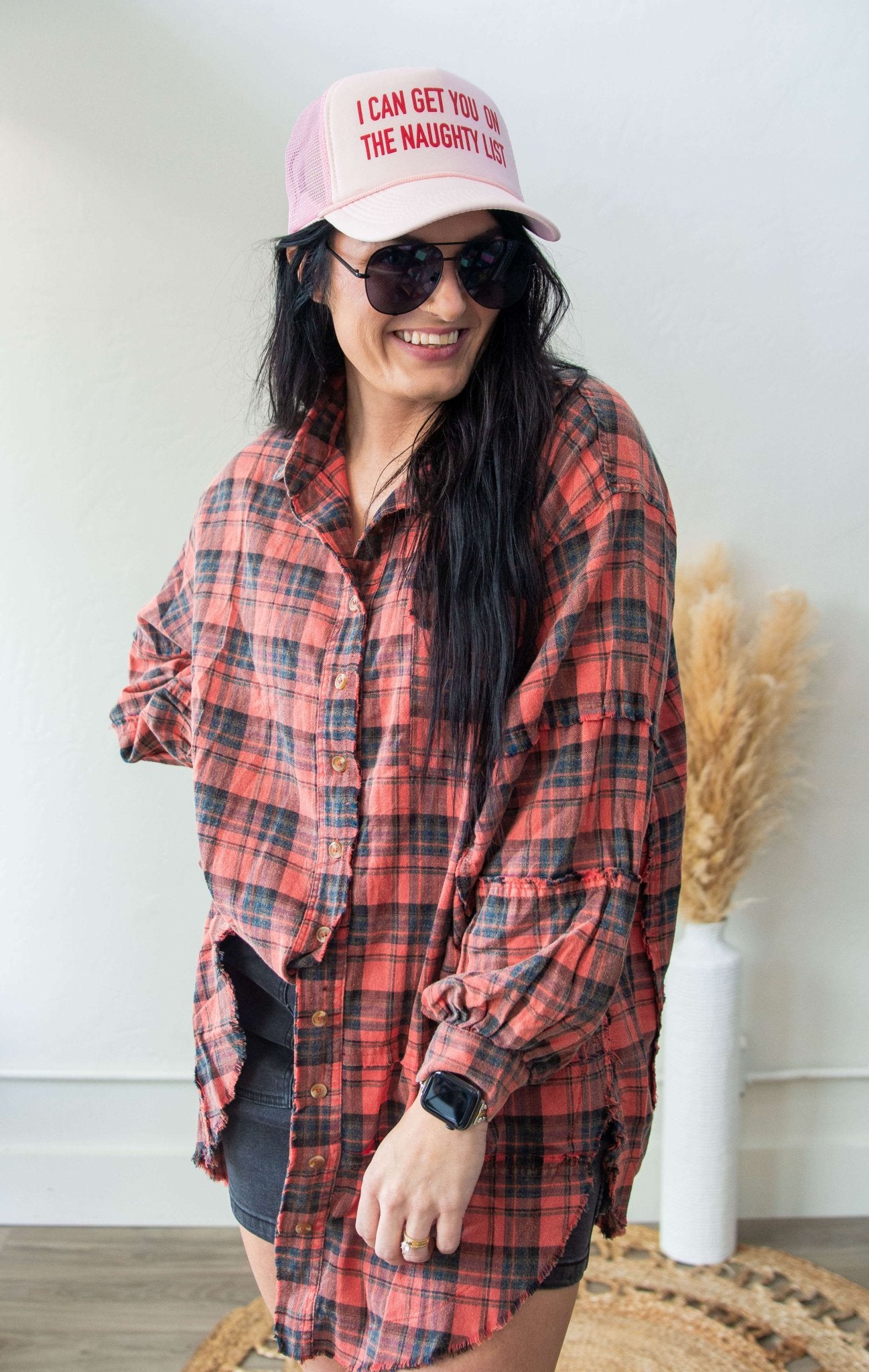 Turn up the sass this season with our Naughty List Trucker Hat! This light pink hat features bold red lettering that reads, "I can get you on the naughty list," adding a flirty and festive twist to your holiday style. With its classic trucker design and adjustable fit, this hat is as comfortable as it is cheeky. Perfect for holiday parties, shopping trips, or just making spirits bright, this playful accessory is sure to land you on everyone's must-have list!